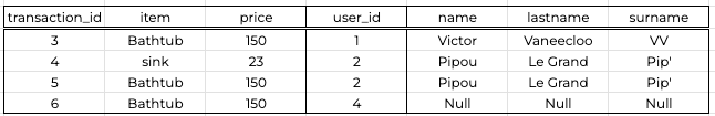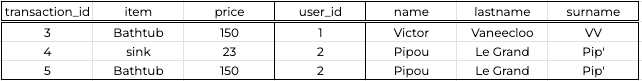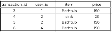 Transactions tableNow, if you were the plumbing website business owner, a question you would ask yourself is what user has purchased most on the website ?